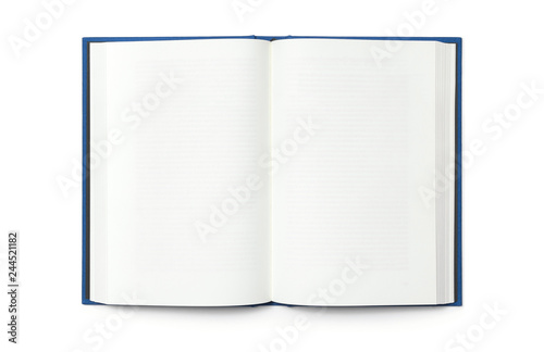 Naklejka premium Blank open book isolated, top front view. Blue hardcover with black