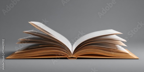 Fototapeta premium Blank open book on gray background showcasing empty pages ideal for design projects and creative presentations
