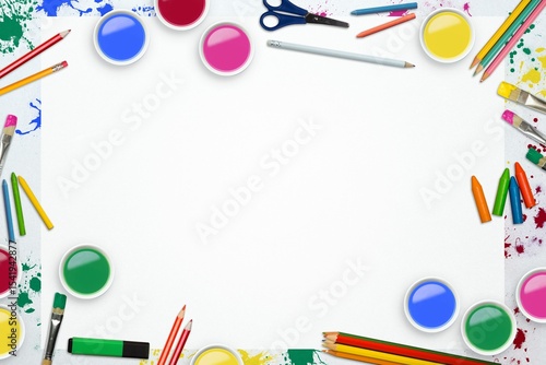 Obraz premium Blank paper is lying on tabletop in flat style, paint containers, brushes and...