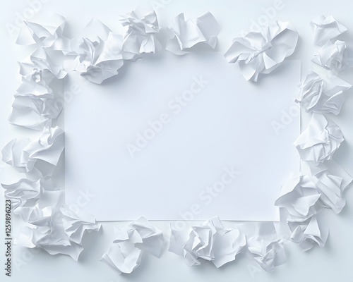 Obraz premium Blank paper sheet surrounded by crumpled white papers. Work progress, idea