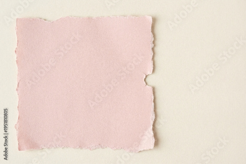 Obraz premium Blank pink torn paper square with deckled edges on a light beige background,...