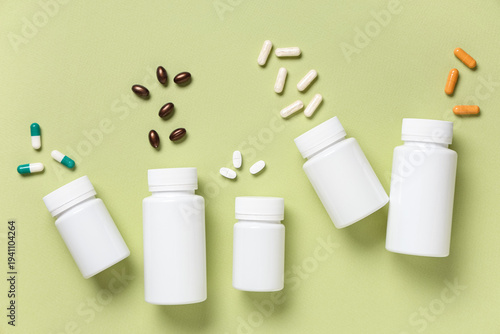 Fototapeta premium Blank plastic vitamin bottles and different pills on green background