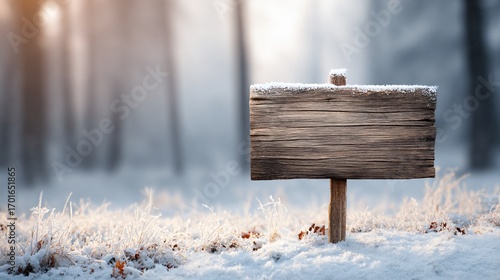 © GankaArt, Fototapeta premium Blank rustic wooden sign in snowy winter forest with frosty grass