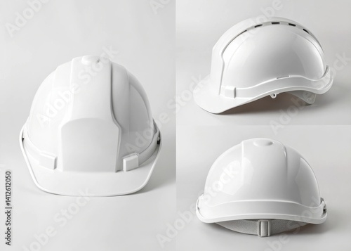 Fototapeta premium Blank Safety helmet mockup White safety helmet showcased from multiple angles on a light background. Ideal for construction or safety themes.