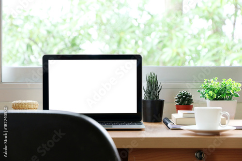 © kathayut, Obraz premium blank screen laptop on the desk at home office