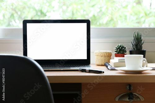 © kathayut, Obraz premium blank screen laptop on the desk at home office