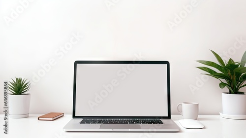 Fototapeta premium Blank screen laptop on white table with mouse and smartphone. Home or office...