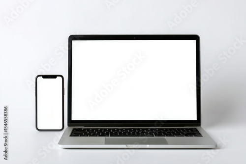 Fototapeta premium Blank screen mockup of a laptop and smartphone on a white background showcasing modern technology and clean design aesthetics