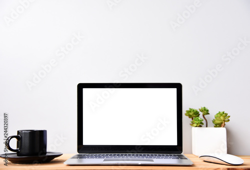 Fototapeta premium blank screen Modern laptop computer with mouse,Smart phone and Succulent on...