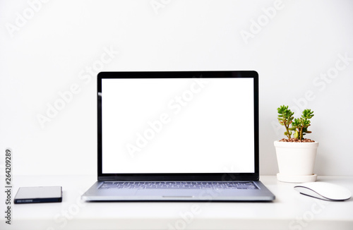 Fototapeta premium blank screen Modern laptop computer with mouse,Smart phone and Succulent on...