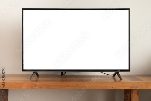 © awaygy, Naklejka premium blank screen television on wooden table at living room.