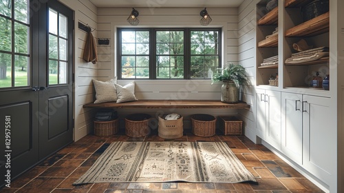 Naklejka premium Blank style mudroom with functional storage clean surfaces and a minimalist...