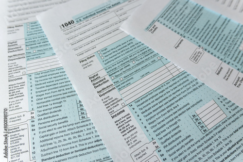 © RomanR, Obraz premium 1040 blank tax form U.S. individual income return on desk