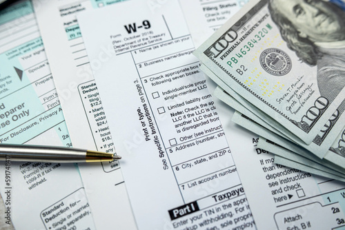 © RomanR, Obraz premium blank tax return form 1040 with dollar banknote