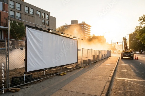 © shahjalal, Naklejka premium Blank urban construction site banner in warm golden hour light with cinematic depth. Ideal for branding, advertising, marketing, real estate, or promotional mockups.