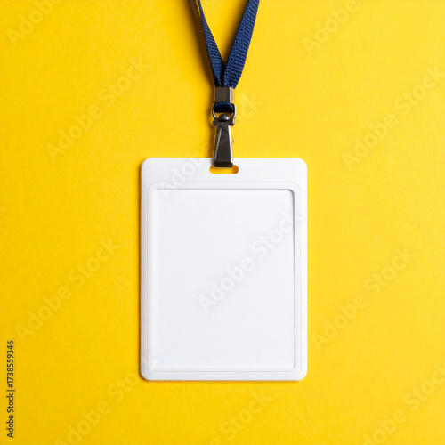 Obraz premium Blank vertical ID card with lanyard, isolated on yellow background, mock-up...