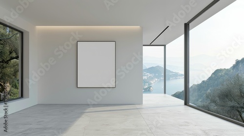 © KALEYA, Obraz premium Blank wall frame in a modern, white-walled gallery space