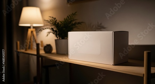 Fototapeta premium Blank white box mockup on a wooden shelf in a warm, cozy room.