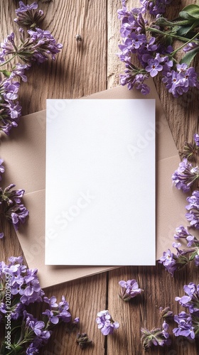 © emzee, Obraz premium Blank White Card Mockup with Purple Flowers on Rustic Wooden Background