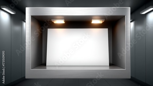 © admin_design, Fototapeta premium Blank White Horizontal Billboard Displayed in a Modern, Lit, Metallic Niche or Showcase.