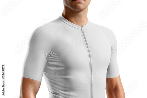© Gustavo Comunello, Fototapeta premium Blank White Short Sleeve Cycling Jersey Mockup on Man