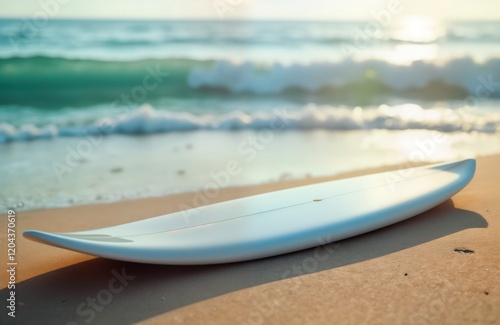 © miss irine, Naklejka premium Blank white surfboard rests on sandy beach overlooking ocean. Calm ocean waves gently lap the shore. Vacation aesthetic. Relaxing beach scene. Surfboard mockup. Ocean view mockup.