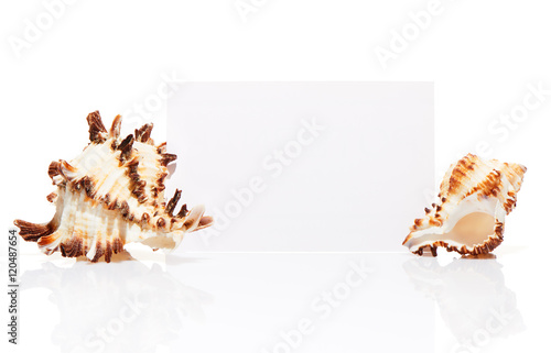 © IntelWond, Obraz premium Blank white visit card with two sea shells isolated