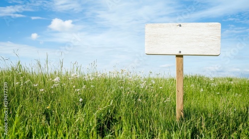 © Sengphachanh25, Fototapeta premium Blank white weathered wooden sign in a green field under a blue sky