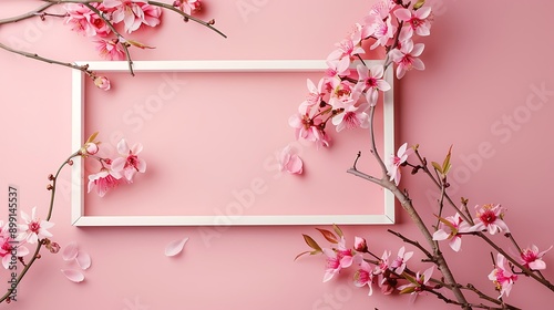 © Robert, Fototapeta premium Blank wooden frame with flower blossoms on pink background