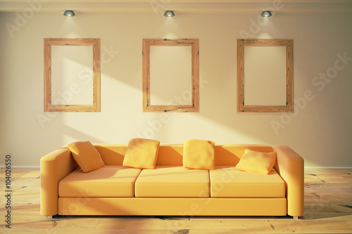 Fototapeta premium Blank wooden picture frames on the wall in modern room with yell