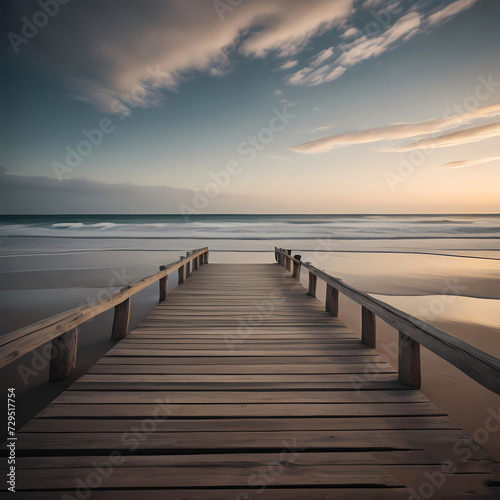 © Md, Fototapeta premium Blank Wooden Planks Framed by a Dreamy Blur of Beach and Sea - A Captivating Canvas of Tranquility.