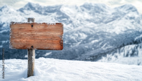 Naklejka premium Blank wooden sign in snowy mountain landscape