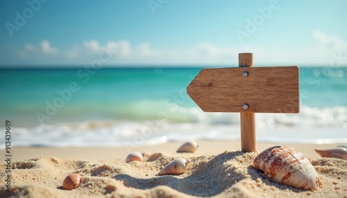 © BOJOShop, Naklejka premium Blank Wooden Signpost on the Beach.