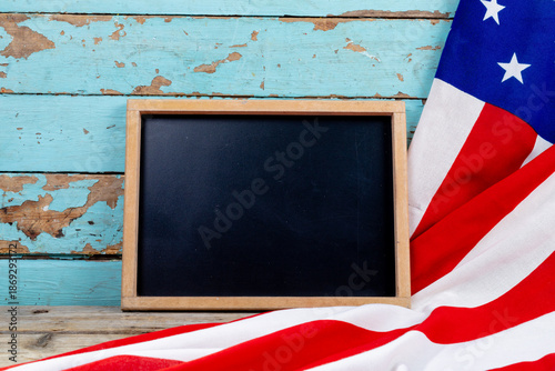 Fototapeta premium Blank writing slate with copy space by usa flag on blue wooden table