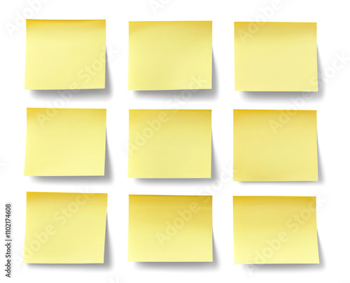 Fototapeta premium Blank yellow sticky notes creating a grid on transparent background
