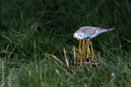 © Martina Berg, Fototapeta premium Blauer Wellensittich im Gras