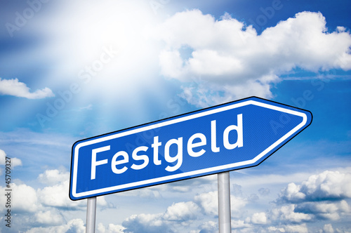 Fototapeta premium Blaues Schild mit Festgeld und Sonne
