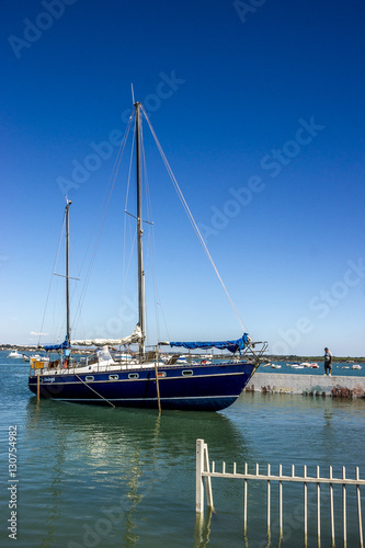 © zauberblicke, Fototapeta premium Blaues Segelboot im Hafen