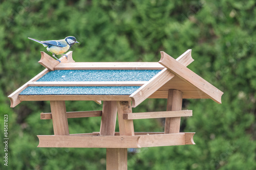 Fototapeta premium Blaumeise auf Vogelhäuschen