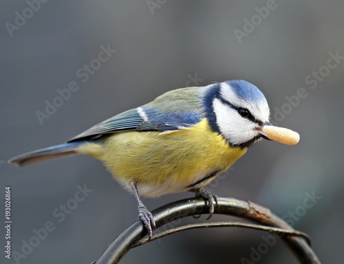 Fototapeta premium Blaumeise (cyanistes caeruleus) mit einer Nuss im Schnabel