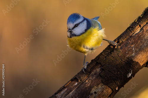 Fototapeta premium Blaumeise mit beim Sonnenuntergang im Frühling auf einem Ast / Vogel