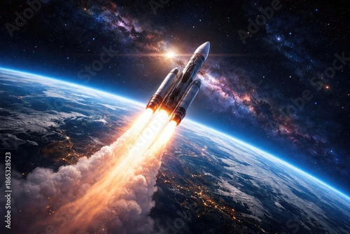 Obraz premium blazing rocket thrust propels spacecraft beyond earth atmosphere