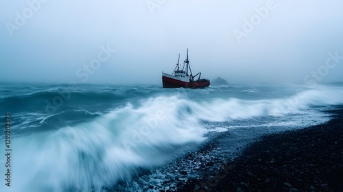 Naklejka premium Bleak and Haunting Seascape - Lone Ship Adrift in Turbulent Ocean,Obscured by Dense Fog