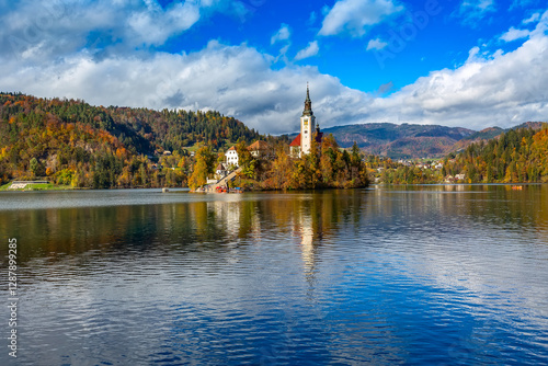 Naklejka premium Bled, Slovenia panoramic view with church