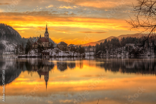 © Kavita, Naklejka premium Bled with lake in winter, Slovenia, Europe