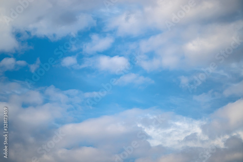 Fototapeta premium Błękitne niebo z białymi fantazyjnymi stosami chmur.
