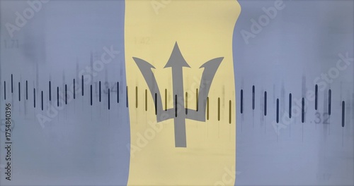 © vectorfusionart, Naklejka premium Blending black trident symbol over Barbados flag stripes, featuring bar charts and numeric labels