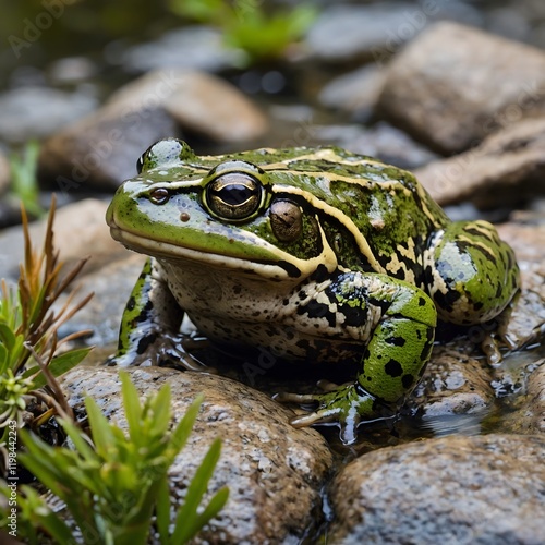 © AmuvitaGamage, Fototapeta premium Blending In: Bullfrog Camouflaged Among Rocks and Lush Vegetation