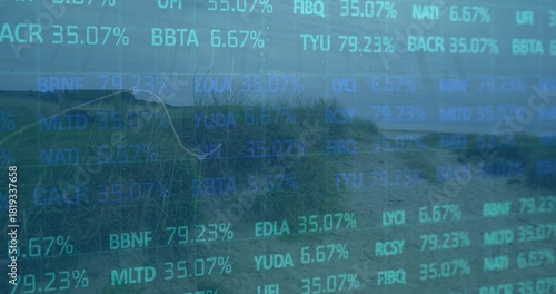 Naklejka premium Blending sand dune center with beach grass and path leading to shoreline, with stock ticker overlay
