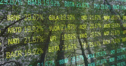 Fototapeta premium Blending tall deciduous tree trunks and dense canopy in wooded forest, with translucent ticker text